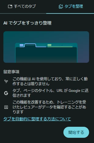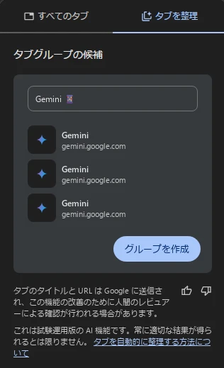 Windows版 Google Chrome Beta(バージョン: 130.0.6723.6(Official Build)beta (64 ビット))に突如、新機能「類似のタブを整理」が登場しました。