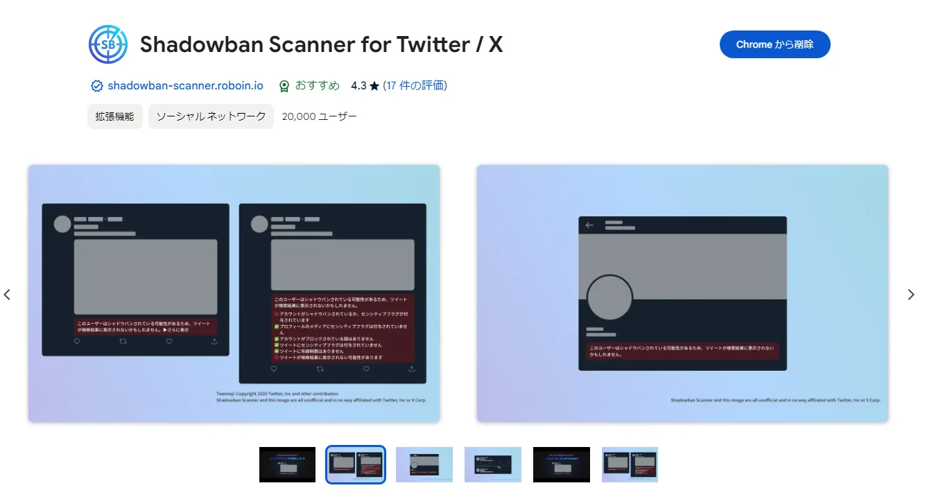 また、ろぼいんさんが開発している Google Chrome拡張機能「Shadowban Scanner for Twitter / X」は、追加(インストール)して簡単な設定をするだけで簡単に確認できますので、そちらもぜひ使ってみてください。