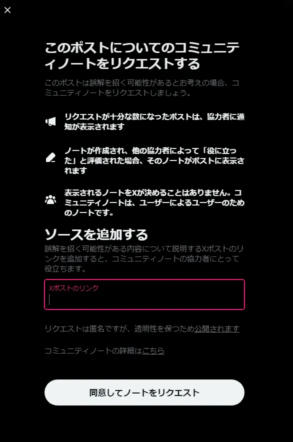 一般的には、「 コミュニティ ノートプログラム 」に参加している一部のX ユーザーが追加するのですが、そうでないユーザーもコミュニティノートの付与をリクエストすることができます。