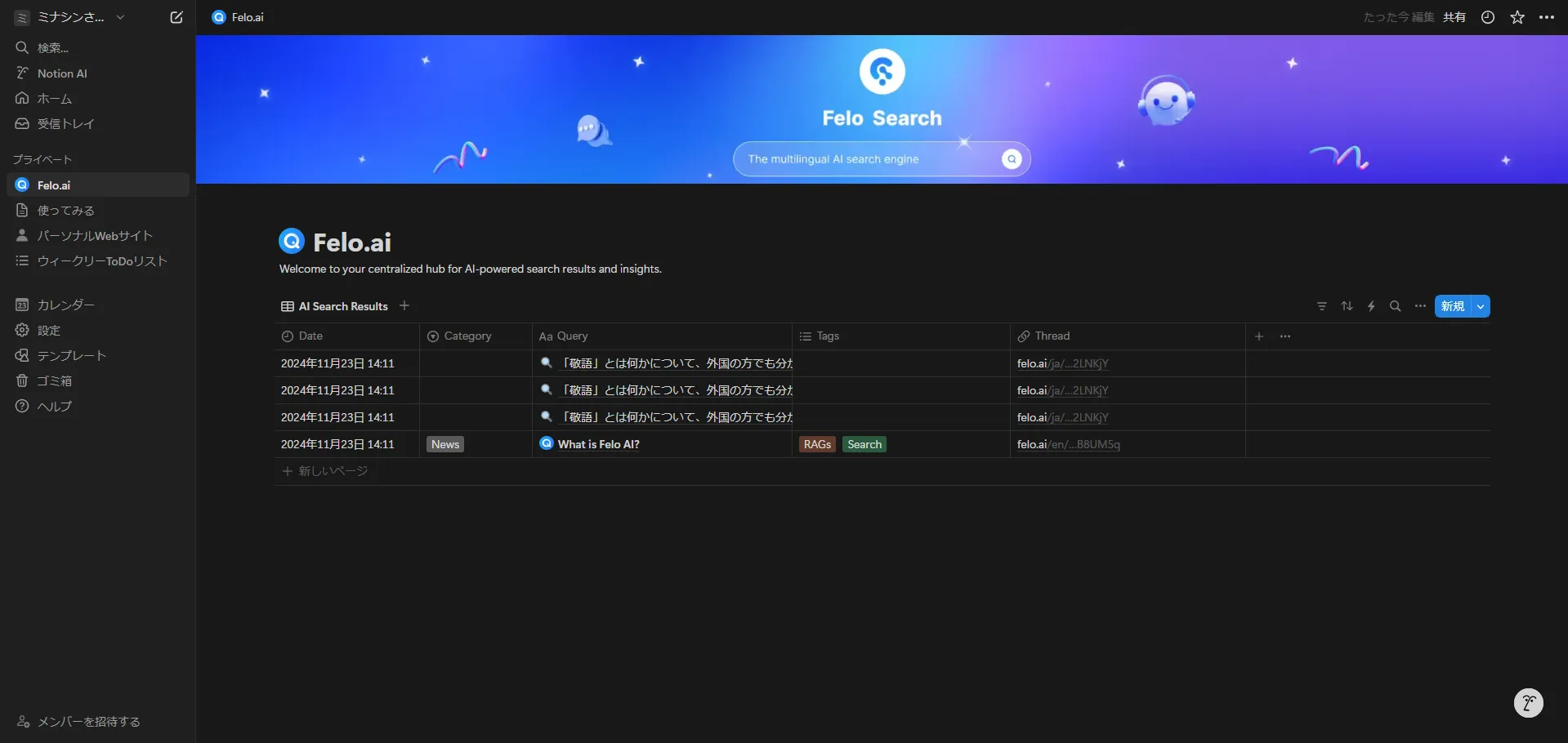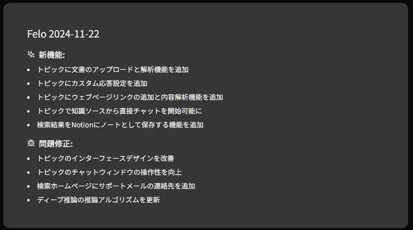 2024年11月22日頃、AI検索エンジンである Felo にて、検索後の回答を Notion に保存できるようになりました。